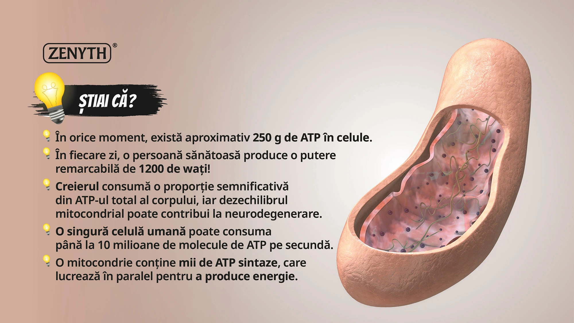 Organismul nu poate stoca ATP, prin urmare mitocondriile trebuie să funcționeze constant tot timpul.